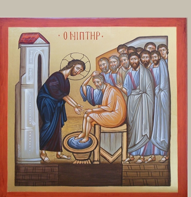 Im linken Bereich wird eine Kirche abgebildet, aus der Christus in gebeugter Haltung hervortritt. Christus drückt auf diese Weise das Dienende aus. Zusammen mit dem vor ihm sitzenden, in ockerfarbiger Tunika gewandeten Petrus bildet er das Zentrum der Ikone. Indem Christus einen Dienst an Petrus tätigt, ist er damit gleichfalls der Handelnde, da er mit hochgekrempelter Tunika dem vor ihm sitzenden Petrus die Füße waschen will. Dieser, ob der Handlung deutlich sichtbar hochverwirrt, greift sich daher fassungslos an den Kopf. Diese Geste ist es, die dieser Ikone ihre Lebendigkeit verleiht, während der restliche Aufbau sehr streng-formal gestaltet ist.