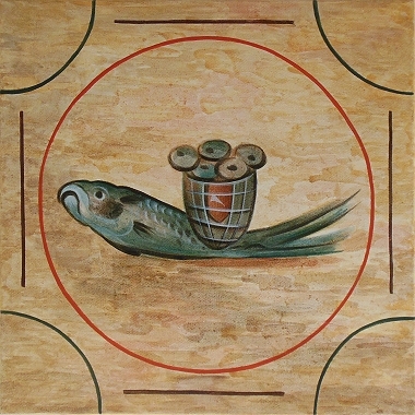 Bleiben wir in der Priscilla Katakombe, woher auch obiger Fisch entstammt. Es zeigt eine weitere unverfängliche Abbildung antikischer Motive mit christlichem Symbolgehalt: Der Gute Hirte, der seine Schafe hütet und eines sogar auf dem Rücken trägt, idyllische Bäume und drei Vogelmotive. Getragen werden, Fürsorge und Trost sprechen aus dieser frühchristlichen Malerei aus tiefen Grabkammern.