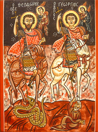 Zu sehen sind zwei Soldatenheilige auf ihren Pferden. Ihre Haltung und die Position ihrer Pferde ist identisch. Das Pferd des Theodor ist rot, das Pferd des Georgos ist weiß. Dies entspricht den allgemeinen, wesentlichen Merkmalen dieser Heiligen. Beiden Heiligen steht je ein Engel auf Kopfhöhe zur Seite. Jeder Engel weist “seinem Schützling” mit einer Geste der rechten Hand gen Himmel: Von dort kommt die Kraft, woher der Soldatenheilige seinen Mut beziehen wird, um das Übel zu besiegen.